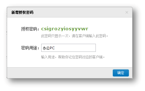 点击“新增授权密码”,页面会显示的授权密码。您可以复制此授权密码粘贴至客户端,授权密码将不再显示。您还可以为授权密码登记用途,以便管理同步邮箱的客户端。