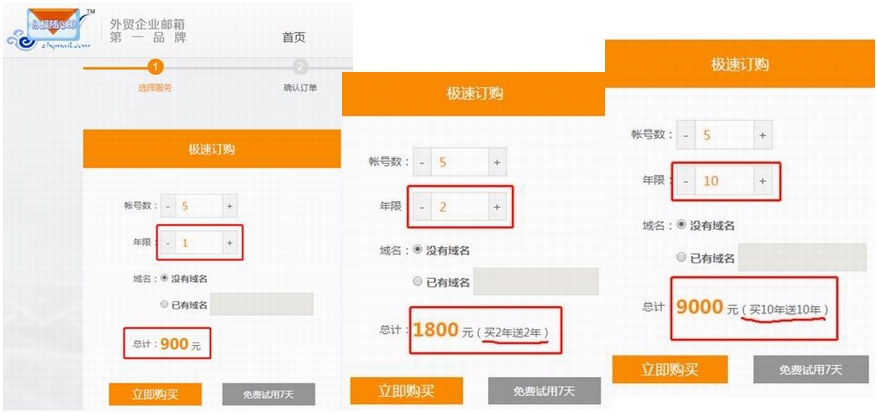接下来就选择邮箱个数,最少5个起。另外一个重要点是选择年限,建议选择2年及以上。因为它的优惠活动是购买两年以上可以买几年送几年的(最长可以做到买10年送10年,只买一年就没有优惠了)