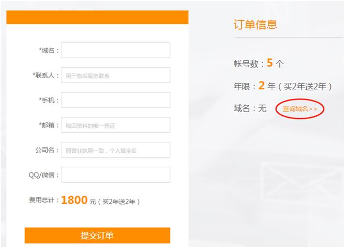 没有域名的,可以点右侧 查询域名 (购买外贸企业邮箱纵横随心邮可免费赠送一个域名的,市场价值是100元一个一年)
