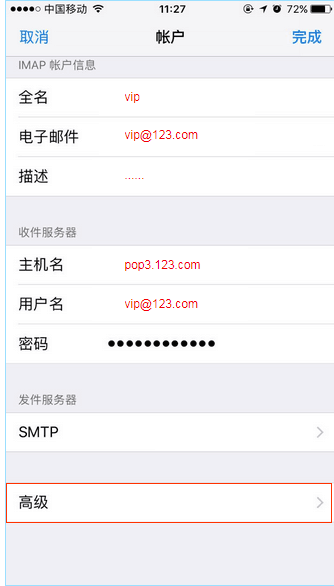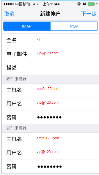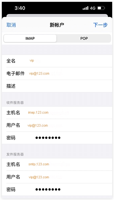 假如您的邮箱地址是:vip@123.com,按照本教程设置前,请先确保在网页端输入您的帐号vip@123.com及密码,收发邮件测试。