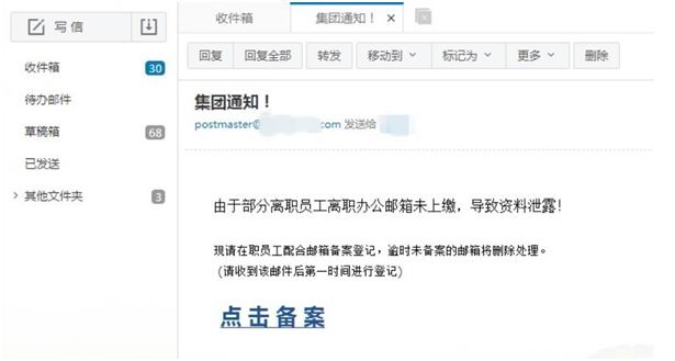 2019年11月8日,某大型国有企业信息化中心陆续接到员工反馈,收到管理员账号发送的疑似OA钓鱼邮件。根据员工反馈的截图显示,邮件发送方为公司内部管理员以集团信息管理部名义向全员发送的“集团通知!”邮件,要求全员点击邮件中地址进行备案。该“邮箱升级审核系统”要求员工输入用户名、登录地址、邮箱密码等信息。经评估,本次钓鱼邮件泄露信息疑似为包括集团领导在内的200名员工邮箱、联系方式及公司组织架构,以及十余名员工邮箱内的全部邮件内容。