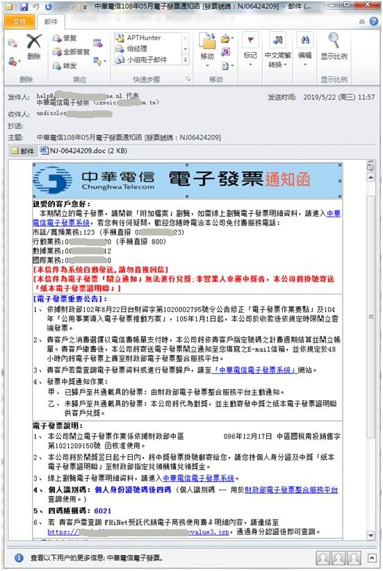 2019年6月,纵横随心邮安全研究团队捕获了一封钓鱼邮件,邮件附件为eml文件:“中華電信108年05月電子發票通知函_[發票號碼:NJ064242].eml”。