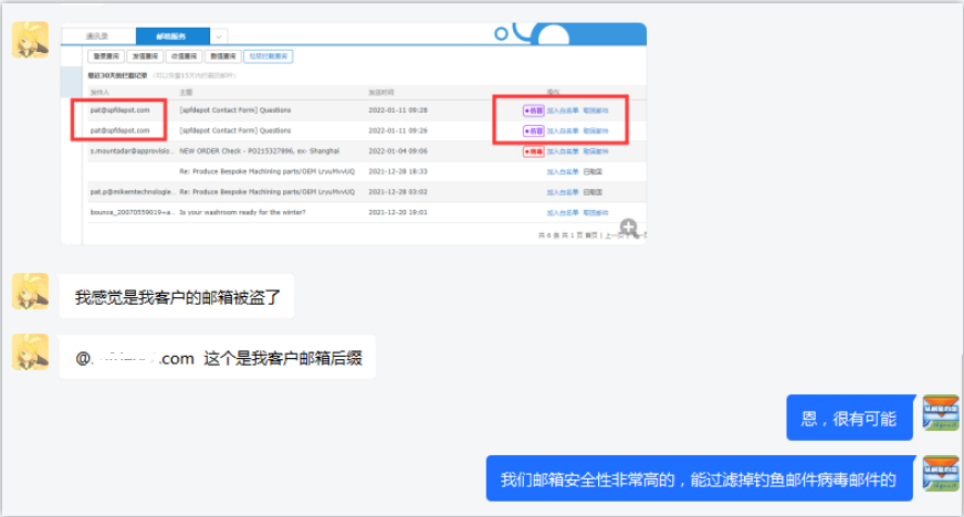 对方的邮箱被盗了,篡改了邮件内容以及收款的银行账号,但被我们的邮箱系统识别出来,及时防止了风险与损失。
