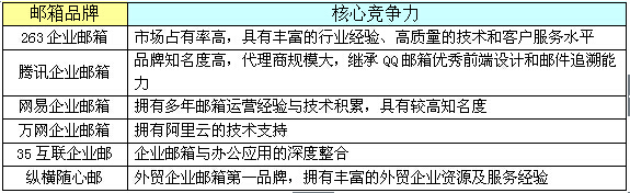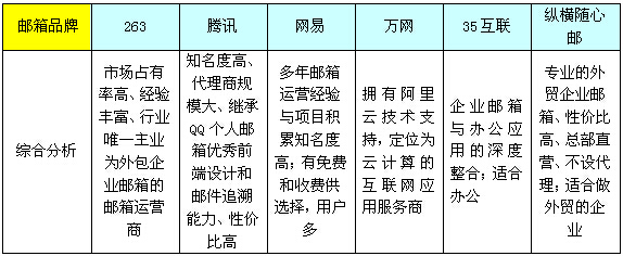 就经验来说,网易是最早开始做收费企业邮箱业务的,之后为了提高市场竞争力又推出了免费的版本;从影响力上来看,腾讯企业邮箱借助其免费邮箱起步,之后才推出收费企业邮箱,从12年开始到14年已经迎头赶上,势不可挡;而从专业角度来说,263更是唯一把收费企业邮箱当成核心业务;万网胜在有阿里云技术的支持;35互联更适合于办公;而对于外贸人来说,纵横随心邮凭借其11年的经验打造出专用的外贸邮箱品牌,更是可以绑定微信,实时监控功能,应该是外贸首选。