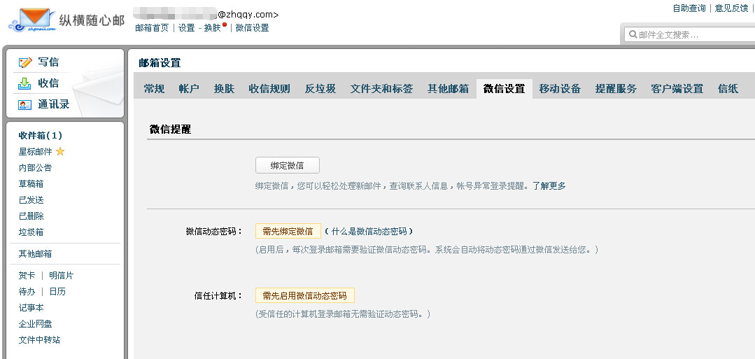 如果你用了纵横随心邮,那么这个方便的功能一定要用一下,那就是用微信来收发纵横随心邮邮件。现在,通过纵横随心邮绑定你的微信,您将可以使用企业邮箱“微信提醒”,使用更方便快捷的移动办公服务。具体步骤,follow me 进入纵横随心邮,点击导航栏上方的微信设置,点击“绑定微信”。 接下来,打开个人微信扫一扫,用个人微信账号扫描二维码。