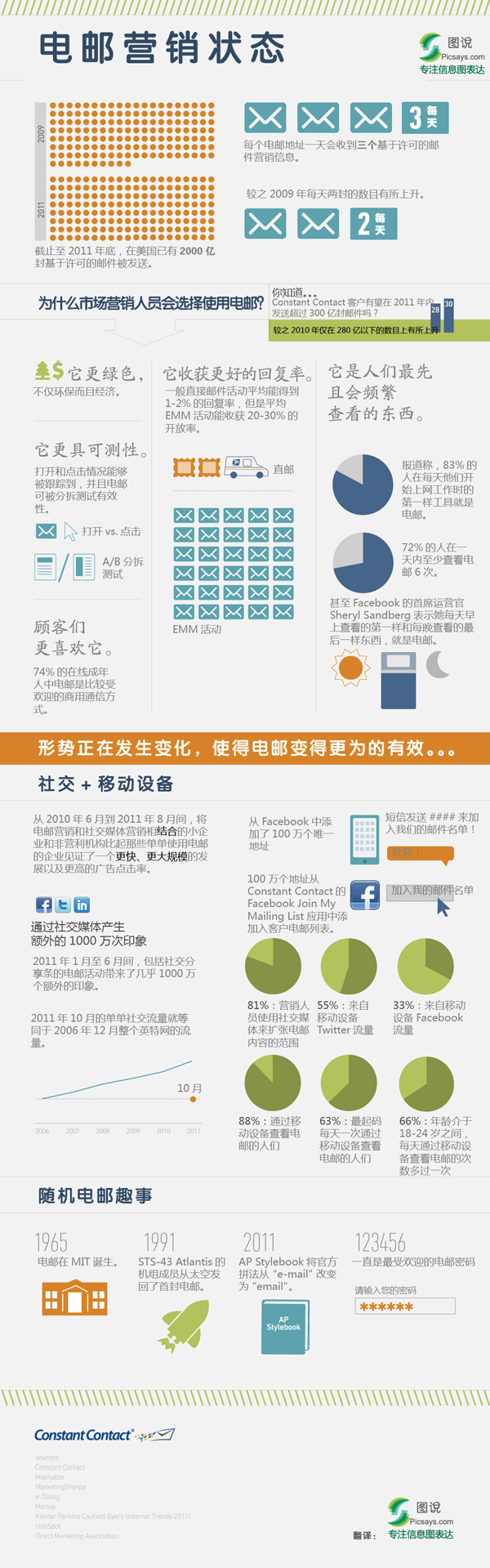 电子邮件对于我们来说并不陌生,日常生活工作中都离不开电邮的交流。为什么市场营销人员会选择使用电邮这种形式呢?随着社会化网站和移动设备的不断发展,电邮营销会呈现怎样的新景象?普通消费者对电邮营销抱有怎样的态度呢,本幅信息图会告诉你答案。