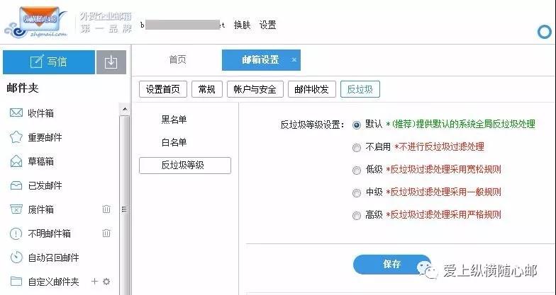 还可以设置反垃圾级别,用户也可根据自身需求选择不启用、低级、中级和高级这4个选项。