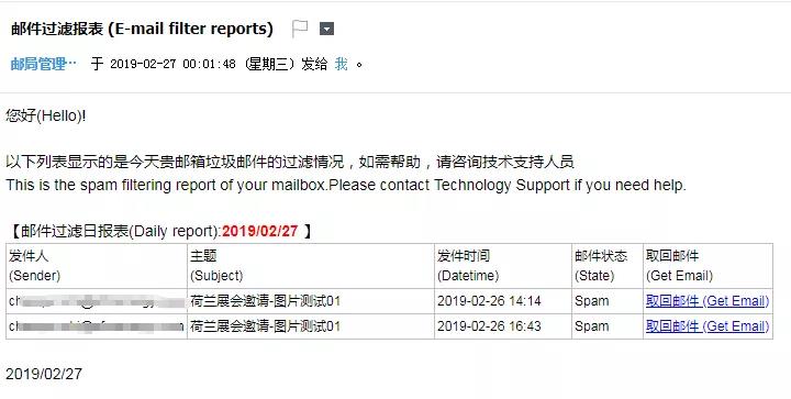 此外,对于误被拦截的邮件,纵横随心邮企业邮箱提供过滤报表功能,用户可及时浏览被拦截的邮件列表并取回需要的邮件。