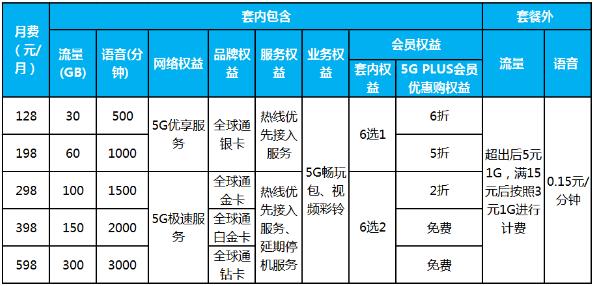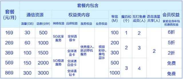 中国移动5G套餐命名为“智享套餐”,分个人版和家庭版。个人版套餐从128元到598元,家庭版则从169元到869元,各有5档,分别拥有相应的网络、品牌、服务、业务和会员等多重权益。参与此前5G商用预约活动的客户还可享受5G套餐的折扣优惠,网龄5年及以上的可享受半年的7折优惠,网龄5年以下的可享受半年的8折优惠。