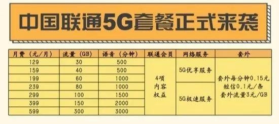 中国联通发布的5G套餐在原有4G套餐的基础上进一步“扩容”,分为129元、159元、199元、239元、299元、399元和599元七个档位,包含的流量从30GB-300GB不等。此前已参与5G套餐预约的用户,可直接享受连续6个月的套餐月费折扣优惠,网龄3年及以上可享7折优惠。