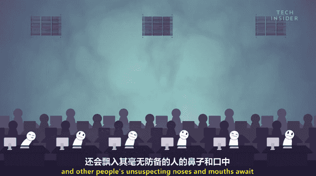 到了体外后,变成4万多个小滴液,每个滴液中都包含中大量的病毒和细菌。