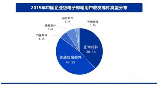 从电子邮箱的使用情况来看,2019年,全国企业邮箱用户共收发各类电子邮件约6448.1亿封,相比2018年企业及电子邮箱用户收发邮件数量增长4.8%。平均每天收发电子邮件约17.7亿封。其中,正常邮件占比约为38.1%,普通垃圾邮件占比为47.2%、钓鱼邮件5.3%、病毒邮件6.6%、谣言邮件1.7%,色情、赌博等违法信息推广邮件约1.1%。也就是说,2019年,在邮件系统收发的邮件中,仅有近4成为正常邮件,垃圾邮件及其他各类非法、恶意邮件等非正常邮件的数量,是正常邮件数量的1.6倍左右。
