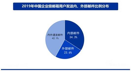不同于个人邮箱,企业邮箱的主要用途是办公。因此,同一机构内部邮件互发往往会比较频繁。抽样统计显示,企业用户发送的电子邮件中,约34.3%为机构内部邮件,23.6%为外部邮件,42.1%为内外通发邮件(收件人既有机构内部,也有机构外部)。