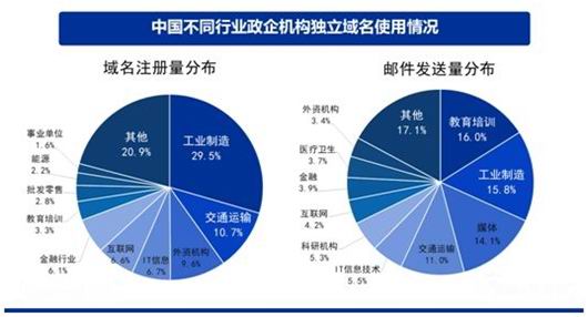 对中国政企机构独立邮箱域名的抽样分析显示,从域名注册量来看,工业制造类企业注册的邮箱域名最多,占比为29.5%,其次是交通运输行业占比10.7%,外资机构占比9.6%;还有IT信息技术占比6.7%,互联网企业占比6.6%,金融行业占比6.1%等,这些都属于电子邮箱使用独立域名较多的行业。