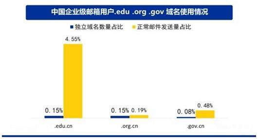 特别的,本次报告对.edu(教育)、.org(组织机构)和.gov(政府)三个域名的邮箱使用情况进行了分析。其中,.edu.cn邮箱域名在全国占比为0.15%,.org.cn的邮箱域名占比约为0.15%,.gov.cn邮箱域名占比为0.08%。而从正常邮件发送量上来看,.edu.cn邮箱占4.55%,.org.cn邮箱占0.19%,.gov.cn邮箱占0.48%。