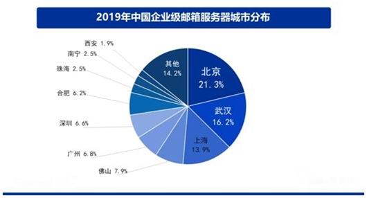 从服务器的所在地来看,2019年,国内企业邮箱服务器设在北京的数量排名第一,占比为21.3%;武汉排第二,占比为16.2%;上海排名第三,占比13.9%。值得注意的是,在2017年的相关统计中,国内有半数以上的企业邮箱服务器是设在杭州市的。这表明,针对政企机构的邮箱服务正在从局部地区高度集中,向全国各地分散开来。这也是全国各地信息化建设水平普遍显著提升的必然结果。