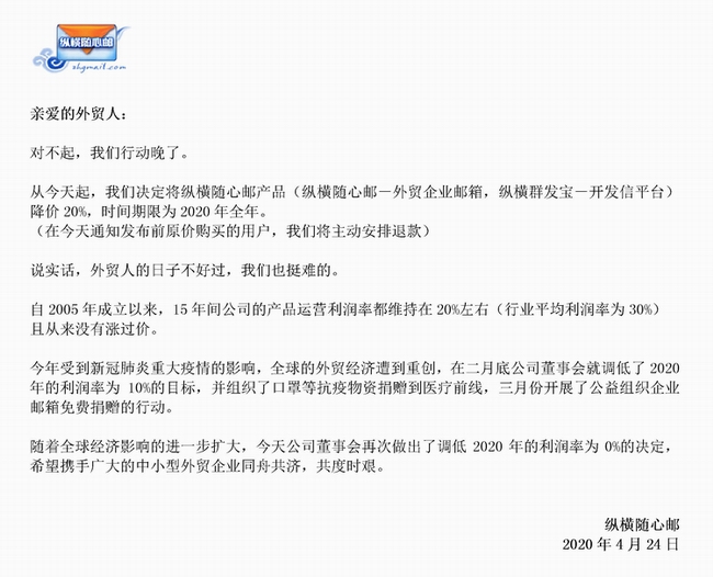 记者:BILLY,您好!很感谢您在百忙之中参加我们的专访!近日,纵横随心邮的一封公开信《纵横随心邮:2020年助力外贸复产抗疫,全线产品降价20%》引发了热议,在2020这个全球疫情期间经济下行的巨大压力下很多企业商家都有涨价的行为,包括部分企业邮箱品牌也都在涨价,为什么你们却不涨反降呢?