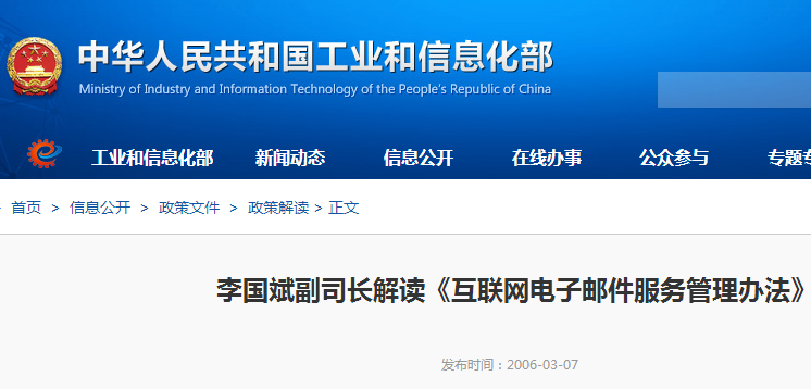 《互联网电子邮件服务管理办法》已经2005年11月7日中华人民共和国信息产业部第十五次部务会议审议通过,现予公布,自2006年3月30日起施行。 部长:王旭东 二00六年二月二十日 互联网
